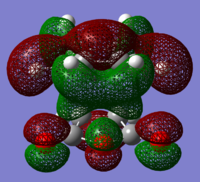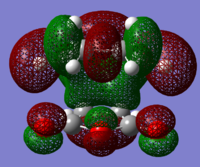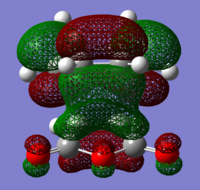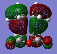 The structures of several MO's for both the exo- and endo- (AM1-optimised) transition states were visualised using GaussView. In addition to simulating the HOMO and the LUMO, the structure of the HOMO-1 and LUMO+1 MO's would also be investigated as well as the HOMO-4, in order to gain a greater insight into origin of the secondary orbital overlap effect which acts to stabilise the overall energy of the endo- transition state with respect to the exo- transition state. This interaction should be present in the HOMO of the endo TS however this is evidently not the case for this simulation. The search for the secondary orbital overlap was conducted by visualising the MO's between the HOMO-4 and LUMO+3, not all of the MO's that were visualsed in GaussView are presented below due to their lack of secondary orbital overlap. The stabilising secondary orbital overlap interaction was only found for the LUMO+1 and LUMO+2 for the endo transition structure. It can clearly be seen below that the p-orbitals of the carbonyl carbon on the maleic anhydride overlap in phase with the p-orbitals of the alkene in the cyclohexadiene molecule, leading to an overall energetically stabilising effect. This stabilsing effect is not present in any MO's for the endo state which agrees with both theory and literature and supports the regioselectivity for the endo product during a Diels-Alder cycloaddition. Although this interaction is not observed within the HOMO this can be explained by two factors, the first is that orbital mixing has not been taken into account (What kind of orbital mixing has not been taken into account? João (talk) 21:27, 16 February 2015 (UTC)) during this simple computational experiments, due to the closeness in energy of the respective FMO's substantial mixing upon combining the two reactants would be expected, this may allow the predicted LUMO+1 and LUMO+2 to be involved in bonding interactions and be subsequently populated with electrons. The second factor to consider is simply computational error, this is a simulation and therefore will be subject to numerous errors, due to the use of a low level basis set this could be why the HOMO of the endo TS does not display the expected secondary orbital overlap.