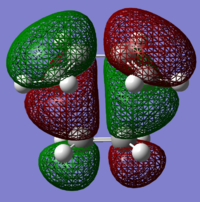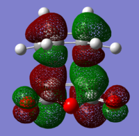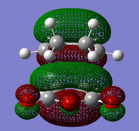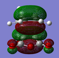 By direct visual comparision between the MO's of the transition state with those computed for the reactants, it can concluded the TS HOMO is clearly a mix of the anti-symmetric butadiene HOMO and ethene LUMO, yielding as expected an antisymmetric MO for the TS. Again this is in agreement with theory with the cycloaddition is occuring with ethene acting as the dienophile and accepting electrons from the HOMO of the electron-rich diene (cis-Butadiene). The significant orbital overlap obsereved in the TS HOMO is again due to both constituent fragment orbitals have the same symmetry, an essential criterion required for an allowed reaction. Similarly it can be noted that the TS LUMO is formed from a combination of the symmetric ethene HOMO with the symmetric butadiene LUMO, again resulting in an overall symmetric MO for the transition state LUMO.