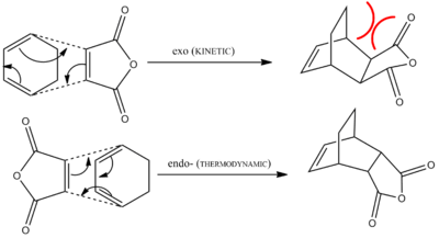 Literature states that conducting this reaction under kinetic control (i.e low temperatures and short reaction times) would result in the endo- product being preferentially formed. However, if you increase the temperature of the reaction vessel, and leave the reaction for a longer period of time, the equilibrium shifts to favour the thermodynamic, exo- product. The endo- product is considered to be the kinetic product, which is kinetically favoured due to the stablising secondary orbital interactions present in the transition state, thereby lowering the energy of the transition state relative that of the exo- form. However, it is known that the exo- product is of a lower total energy than the endo- product, due to the larger degree of steric strain present within the endo product.[14]