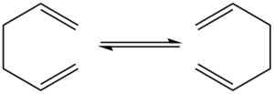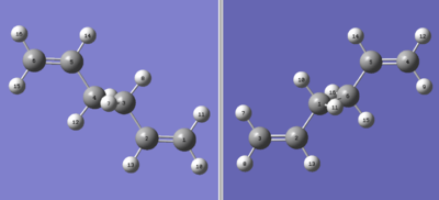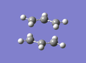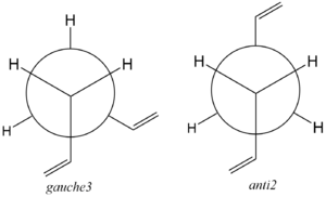 In addition to this, standard organic chemistry would predict that the anti conformation would lie lower in energy relative to the gauche due to the presence of the 180 degree dihedral angle between the carbon atoms along the hydrocarbon chain. Contrary to what was expected, the gauche 3 conformation obtained possesses a more negative energy value and hence, according to this computational optimisation, exhibits higher stability with respect to the anti 3 conformation. This apparent anomaly has been attempted to be rationalised by Rocque et al[6] who suggests that stabilising hydrogen bonding between the vinyl hydrogen's and the pi electron clouds of the hydrocarbon chain, are enough to stabilise the gauche conformer relative to the anti. However multiple sources have also reported that, as one would expect, the anti conformer is indeed the most stable, thus one would remain skeptical when confirming this by a computational calculation, due to the level of approximation which is inherent to this type of chemistry. However, to allow an effective comparison with the results obtained by H. Rzepa, the most stable conformers of 1,5- Hexadiene would be subjected to approximately the same level of computational analysis, by repeating the optimisation calculation, this time using a DFT/B3LYP method, under a 6-31G* basis set. It was hoped that the using this more comprehensive method of optimisation would yield more accurate results (Did you actually do the comparison for different conformers? João (talk) 21:27, 16 February 2015 (UTC)). The figure below displays the two conformations in their respective Newman projections: