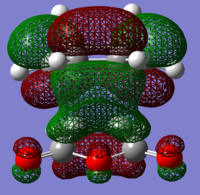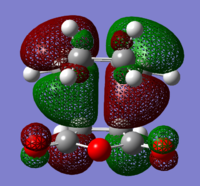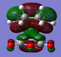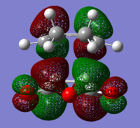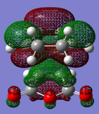 Theory suggests that the secondary orbital effect should be observed in the HOMO of the endo transition structure. However on further examination of the orbitals this is not the case, there is no observable in-phase overlap between the carbonyl-based orbitals and the orbitals of the C=C double bond on the cyclohexadiene fragment. However upon inspection that can be seen that this secondary orbtial overlap is present for the endo structure in both the LUMO+1 and the LUMO+2, both of these stabilising overlaps of in phase orbitals is not present in the corresponding MO's for the exo structure. Although the calculation is not perfect, it may also be suggested that this apparent secondary orbital overlap simply does not occur, the LUMO+2 orbitals do not contribute to bonding and can therefore be disregarded, all bonding orbitals (HOMO and lower) show no sign of the supposed secondary orbital overlap, for this specific computational calculation.