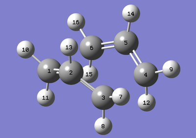 Due to the free roation about the multiple C-C single bonds, 1,5 - hexadiene can adopt several possible conformations. Initially a conformer of 1,5-hexadiene with an anti-periplanar linkage was analysed by performing an optimisation calculation,on the cleaned structure, using the Hartree-Fock method, under a 3-21G basis set. The point groups were determined by using the 'Symmetrize' option on the Gaussview interface. Following this a gauche conformer of the 1,5-hexadiene was optimised using the same method, the results of these optimisations are displayed in the table 1 below. These first two optimisations were obtained from initial "guess" conformations, they were subsequently assigned, according to their optimised structure and total energy, to the corresponding conformer in Appendix 1.