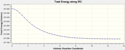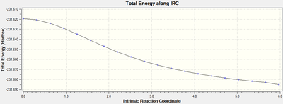 The initial IRC calculation was performed by computing 50 points along the intrinsic reaction coordinate, corresponding to the collapse of the chair transition state, in the forward direction only. The LOG file for the resultant structure that was returned from this calculation can be found here.