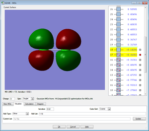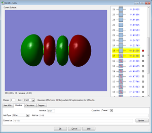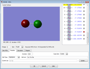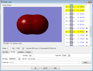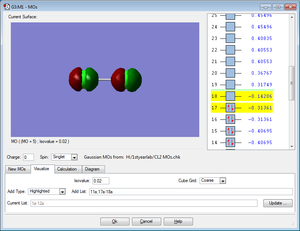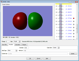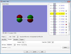 The MO shows the highest bonding molecular orbital for the Cl2 molecule. It is an occupied anti-bonding MO created from 3p orbitals of x orientation.