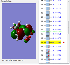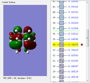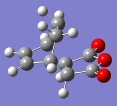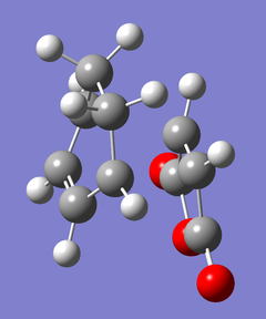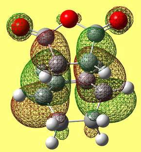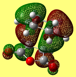 The secondary orbital overlap effect is an effect that has been envoked to explain the selectivity of the Diels Alder reaction for the endo isomer over the exo one. The theory is that there are other orbital overlap interactions that are significant in the transition state other than the HOMO - LUMO interactions. It has previously been reported that for certain reactions, these secondary orbital overlap interactions are only present in the endo TS, meaning it is formed faster and thus made preferntially.[8] It can be seen in the endo TS above, that there is a nodal plane between the two fragments that compose the transition state. As HOMO LUMO orbital overlap is thought to be a prerequisite for getting a particular isomer, this cannot explain why the reaction proceeds. Secondary orbital overlap must therefore be envoked to explain why the endo form, the kinetic product predominates. |