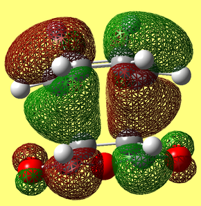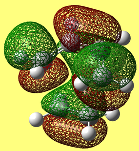 Whether the Diels-Alder is normal or inverse electron demand will determine whether the HOMO is located on the diene and the LUMO on the dienophile or vice versa. In this case the reaction is likely to be normal electron demand, with the HOMO located on diene (cis-butadiene) and the LUMO located on the dienophile (ethylene). The LUMO of cis-butadiene was shown to be symmetric in the previous section and the HOMO of ethylene (π bonding orbital) is also symmetric. These orbitals can therefore overlap effectively. Conversely, if the reaction were to proceed by an inverse electron demand, this is still allowed by orbital symmetry. The HOMO of cis-butadiene and the LUMO of ethylene (π* antibonding orbital) are both antisymmetric. The reaction is allowed, as both the HOMO and LUMO are of the same symmetry and therefore overlap efficiently.