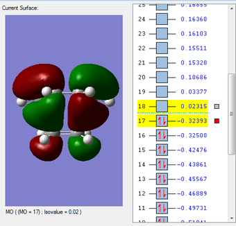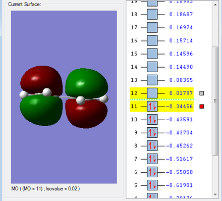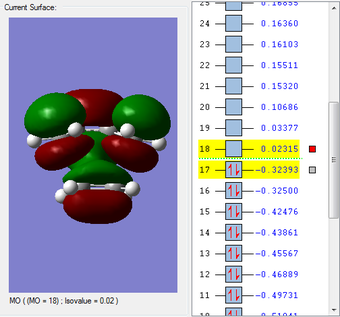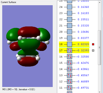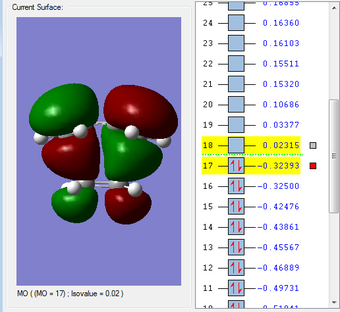 The HOMO is antisymmetric with respect to the plane of the molecule, whilst the LUMO is symmetric. |