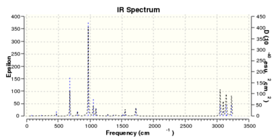 - The results of the IR calculation showed only real vibration frequencies (i.e. none reported with negative values). This is expected, as the spectrum was calculated for a 'real' molecule rather than a transition state. Some of the vibrations have been animated and are shown below.
