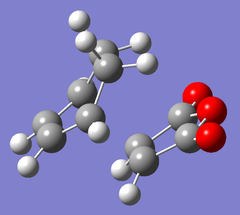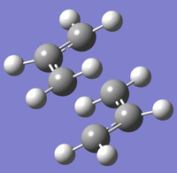 The formation of the two bonds in the TS (corresponding to the imaginary vibration) appears to be synchronous when animated above. However, the lowest energy vibration appears to show a 'waggling' type motion between the two carbons corresponding to the ethylene reactant and the butadiene framework. In most Diels-Alder reactions, C-C bonds form very shortly (within 50 femto seconds [fs]) of the TS. The two different C-C bonds tend to form within 5 fs of each other which means that any bond stretching vibrations do not occur on a timescale which can prevent the bond forming being synchronous.[5]. |