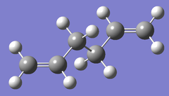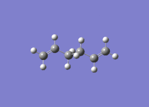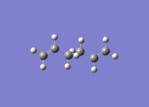- 1,5-hexadiene with an anti linkage about the central four C atoms was optimized using the HF/3-21G level of theory. The resulting structure corresponded to the anti2 structure within [Appendix 1] of the experimental script. The symmetry of the structure, and its energy was obtained from the calculation.