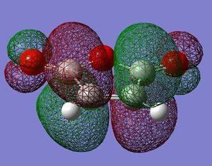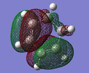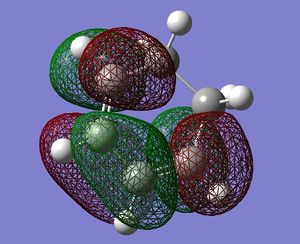 The HOMO and LUMO of the transition state structure are shown on Figures X and Y respectively. It can be seen from the figures, that the HOMO is antisymmetric and LUMO antisymmetric with respect to the central plane. The symmetry considerations allow to conclude the following mixing relations: