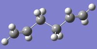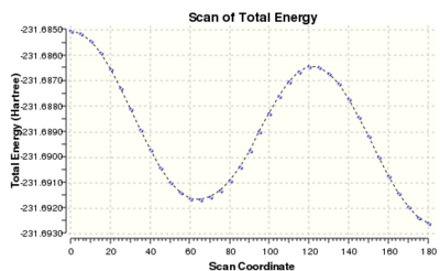 The scan profile of the central dihedral (C2-C3-C4-C5) of a butane molecule is well-known. Staggered conformations are energy minima, while eclipsed conformations can be regarded as transition states between them. It is also known that antiperiplanar structure is slightly (0.9 kcal/mol) lower in energy than gauche conformations. To find the influence of unsaturation on the both ends of hexadiene molecule, a relaxed scan of the dihedral angle around the central C-C bond was performed. The starting structure had an s-cis conformation with carbon atoms contained in one plane. The calculation was conducted at HF/3-21G and consisted of 36 steps of 5 degrees, encompassing a half of the full angle, which is sufficient due to the symmetry of the molecule. The scan profile is shown on the right. The minimum just above 60 degrees corresponds to a gauche conformation and the minimum at 180 corresponds to antiperiplanar conformation. The calculation suggests that the gauche conformation is higher in energy than the app by 0.60 kcal/mol.