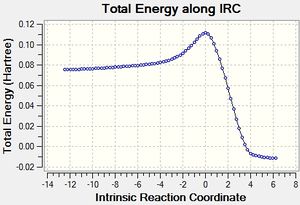 A guess for the structure of transition was made by making slight changes to the reactants and arranging them in a sensible manner. An optimization to transition state was requested using the AM1 semi-empirical method and a frequency calculation at the same level of theory showed one imaginary frequency, which is presented on the central figure and agrees with the expected vibration. An IRC calculation in both direction confirms that the transition state is between reactants (figure on the left) and the cycloaddition product (right). A plot of the IRC calculation allows to estimate the reaction energy barrier. A more accurate result can be obtained from energy values in the table below.