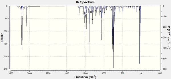 This is done using a similar molecular modeling technique to the NMR analysis above. A Gaussian Input File in 3DChemBio Ultra and minimising the energy using method DFT=mpw1pw91, then submitting the calculation to the shared SCAN server with instruction