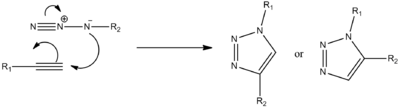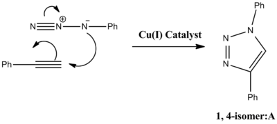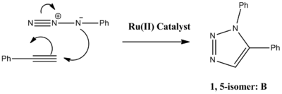 The reaction can be improved with use of a copper catalyst. (In 2002, two groups reported independently that the use of a Cu(I)-catalyst greatly speeds up the reaction.) Use of a Cu(I) catalyst however, leads to the predominant formation of isomer A. It has since been noted that use of a ruthenium (Rh(III)) catalyst leads to the predominant formation of isomer B. In this experiment the R groups will both be phenol groups. Reactions schemes for these reactions are shown below, in addition to 3D jmol representations of isomers A and B: