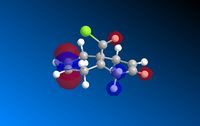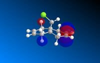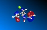 The HOMO contains the highest energy electrons that would theoretically enable the molecule to act as a nucleophile. This can be determined by using the molecular orbitals to see which double bond the HOMO lies over. It can be seen from the HOMO orbital diagram that the π electron density lies over the endo or 'syn' double bond (wrt Cl) and therefore it is predicted that this alkene will be most likely to react with an electrophile.