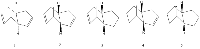 The geometries and energies of the four species, exo dimer 1, endo dimer 2, and dihydro derivatives 3 and 4 (that occur before the dimer is fully hydrogenated to the tetrahydro derivitive, 5) will be calculated.