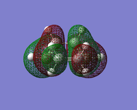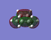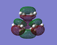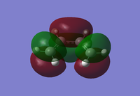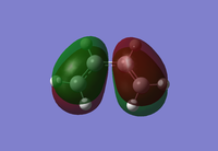 The LUMO shows an area of 'virtual electron density' where the product bond is expected to form. This results from the dieneophile drawing electron density towards itself from the diene as the reaction progresses. This depicts the donation of the π orbital of ethene into the π* orbital of cis-butadiene.