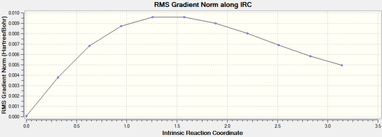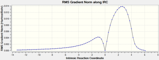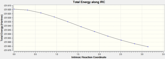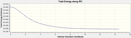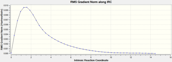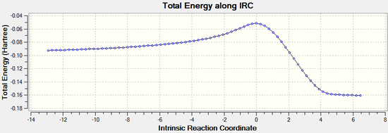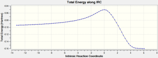 The Gaussian calculation option, IRC under the Job Type tab was chosen. Since the reaction coordinate is symmetrical, it was only computed it in the forward direction. In addition, the the force constants were set to be calculated at every step along the IRC, and the number of points along the IRC was set to 50.