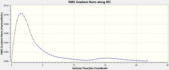 By opening the chk file with all the intermediate geometries it is possible to see how the calculation progressed. The graphs depicting the total energy along the IRC and the RMS gradient along the IRC clearly show that a minimum geometry has not yet been reached: