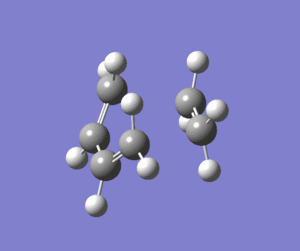 The boat transition structure will be optimised using the optimized Ci reactant molecule 'anti 2' from the table in part A. By selecting File → New → Add to MolGroup it is possible to read multiple geometries into GaussView. Two molecules can be viewed side by side so both molecules can be viewed simultaneously.