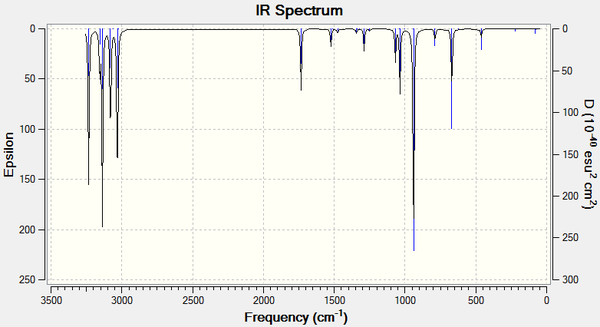 There are no imaginary (negative) frequencies, only real ones, and so the frequency calculation can be assumed to have run successfully. The IR spectrum is shown below: