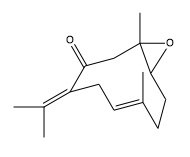 Using Reaxys with a query of an epoxide with an optical rotation greater than 500o, a molecule called germacrone-1,10-epoxide was found (Figure 33). The alkene precursor to this molecule is germacrone, which is an antiviral isolate of Geranium macrorrhizum[11]. This substance can also easily be sourced from Sigma Aldrich.