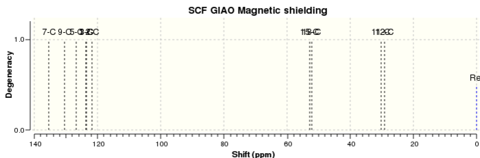 The other possibility of course is that an incorrect conformation of the molecule was produced when attempts at optimisation were made. The conformation on which the 13C NMR analysis in the literature was performed may not match the conformation obtained here. It should be noted however that if this were true, it would be reasonable to assume that the 1H NMR calculations would also not match the literature, which, as discussed above, was not the case.