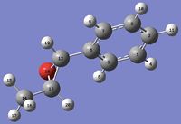 Figure 27 shows the computed IR spectrum of trans-β-methylstyrene oxide. There is a strong absorption between 750 and 900 cm-1 (red circle). This is likely due to C-O bond stretching in the epoxide ring. There is also a strong absorption between 3050 and 3100 cm-1 (blue circle). This is due to C-H bond stretching in the epoxide rings. Finally, there is a strong absorption between 3100 and 3200 cm-1 (blue circle). This is again due to C-H stretching, but this time in the phenyl group (blue circle).