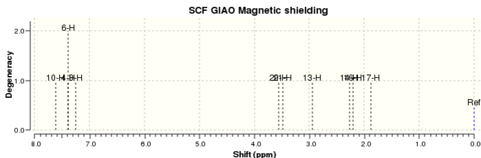 The geometry of molecule 7 was optimised using a MMFF94s force field and the 1H NMR (Figure 8) and 13C NMR (Figure 9) spectra in C6D6 were calculated (DOI:10042/26696 ).