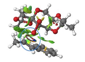 The green cloud-like features in Figure 31 represent moderately attractive van der Waals interactions within the transition state. Specific interactions of note are between hydrogen atoms of adjacent methyl groups and those of the oxygen atoms at the anomeric centres with the hydrogen atoms of the methyl groups adjacent to them.