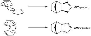 Cyclopentadiene dimerises via a Diels-Alder mechanism, whereby one of cyclopentadiene molecules provides the diene requirement and the other molecule acts as the necessary dienophile. The reaction can proceed in two ways, which are summarised in Figure 1. One possibility is that the double bond not taking part in the reaction is orientated away from the cyclopentadiene molecule that is acting as the diene. This results in the exo product (1) being formed. The non-reacting double bond being pointed away from the diene means its MOs do not engage in any stabilising/destabilising interactions in the transition state. The other possibility is that the double bond not taking part in the reaction is orientated towards the diene. This results in the endo product (2) being formed. In this case the orbitals on the non-reacting double bond can engage in stabilising/destabilising interactions in the transition state. More specifically, looking at the HOMO-LUMO orbitals in the transition state (Figure 2), one can see that there are attractive through-space interactions between the diene and dieneophile orbitals due to both having the same symmetry and phase. Extra stabilisation in the transition state for the endo product comes from the ability of the non-reacting double bond to engage in some through space interactions with the diene orbitals, due to its proximity to the diene. This cannot be said for the transition state of the exo product, whereby the non-reacting double bond is too far away to engage in such interactions.