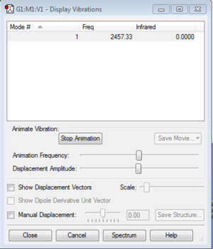 How many modes do you expect from the 3N-6 rule? 6 Which modes are degenerate (ie have the same energy)? 2 and 3, 5 and 6 Which modes are "bending" vibrations and which are "bond stretch" vibrations? 1,2 and 3 are bending vibrations, 4,5 and 6 are bond stretch vibrations Which mode is highly symmetric? 4 One mode is known as the "umbrella" mode, which one is this? 1 How many bands would you expect to see in an experimental spectrum of gaseous ammonia? 2 bands because there are two large peaks, but the other peaks are too small relative to the larger peaks so are not counted.