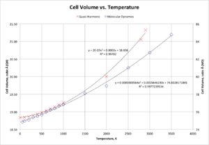 In order to allow for a comparison of this technique with that of the quasi-harmonic approximation, Figure 9 presents a graph of cell volume against temperature for data from the quasi-harmonic calculation, alongside molecular dynamics data. Note that to present both sets of data on the same graph, the molecular dynamics data is presented using a different scale; however, the equations for the trend-lines are directly comparable.