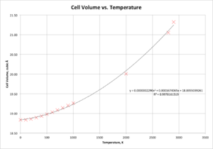 and therefore, only the gradient of this approximated linear fit is required to calculate the thermal expansion coefficient. This calculation, using a gradient of 0.0006922 Å3 K-1 and a V0 of 18.9801 Å3 (the initial cell volume at 500 K) yields a value for α of 3.65 x 10-5 K-1. Comparison of this value to literature, for which a typical value of α is 1.08 x 10-5 K-1 at 273 K,[12] shows that there is a substantial degree of inaccuracy in making this linear approximation.