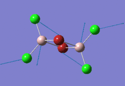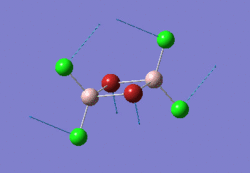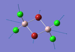 For the reaction 2AlCl2Br → Al2Cl4Br2, ΔE = EAl2Cl4Br2 - 2EAlCl2Br. Therefore, ΔE = -2352.41628814 - 2(-1176.19013679) = -0.036 hartrees. This is equivalent to -94.55 kJ mol-1, so the dissociation energy of the dimer will therefore be +94.55 kJ mol-1. Comparing this value to the dissociation energies calculated for compounds of the form Al2X6 (where X is a single halide) shows that this value is of the correct order of magnitude, although it seems a little high compared to a calculated dissociation energy for Al2Cl6 of 14.53 kcal mol-1 (60.79 kJ mol-1).[6] The value also shows that, at room temperature, the dimer will be more stable than two monomers because the dissociation energy is many times larger than the value for RT at 298 K, 2.48 kJ mol-1. Forming the dimer allows each Al atom to complete its octet, making it more electronically favourable than the monomer, which only has six valence electrons.