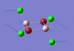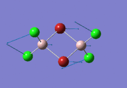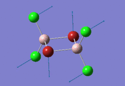 The modes reorder when the bromine atoms are switched between terminal and bridging positions. This is due to the different force constants of the Al-Br and Al-Cl bonds and the different sizes of the Cl and Br atoms affecting the ease with which the molecule can vibrate in a certain way. The reordering can mostly be seen with the bends in rows 3-6 of the table; the bending modes involving primarily motion of the bridging atoms increase in energy while those that require the terminal halides to move more are lowered in energy. The larger size of Br compared to Cl causes a decrease in the vibrational frequency, so vibrational modes which involve significant motion of Al-Br bonds will be lower in frequencies. This trend continues throughout the vibrational modes. Some reordering is seen between the stretches 12 and 13 when there is one bridging bromide, but the original order is restored in the isomers with no bridging bromides; therefore, the order of these stretches could be greatly affected by the symmetry or asymmetry of the molecule.