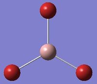 The optimisation of the BBr3 molecule was carried out in Gaussian using the B3LYP method, as with BH3 and GaBr3, while the basis set used a mixture of a standard basis set and pseudopotentials. By editing the input file manually,the B atom was set to be modelled with the 6-31G(d,p) basis set while the Br atoms were modelled by pseudopotentials from the LanL2DZ set. The total energy of the molecule was found to be -64.43644651 au and the dipole moment was 2x10-4 D as a result of small deviations from planarity. The gradient of the potential energy surface was 9.41x10-6, a value very close to 0 which proves the success of the optimisation. The log file for this optimisation is located at DOI:10042/26909 .