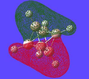 Another difference that must be noticed is that LUMO (really being the pz) is very large (more diffuse) and is acutally covering the hydrogen atoms. This is because in calculating the MOs the unoccupied orbitals aren't calculated accurately as really only the occupied orbitals in the ground state are important in the calculation and so represented well.