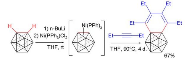 - ↑ Liang Deng, Hoi-Shan Chan, and Zuowei Xie (2006). "Nickel-Mediated Regioselective [2 + 2 + 2] Cycloaddition of Carboryne with Alkynes". J. Am. Chem. Soc. 128 (24): 7728–7729. DOI:10.1021/ja061605j
