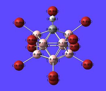 Another thing that must be considered is the site of protonation of the carbanion in the protonated version (i.e. where would it protonate if it had to?). In order to do this the optimised standard (i.e. all borons with chlorines attached) superacid was run through an NBO charge analysis. This is run using the following: