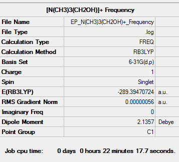 The frequency analysis is carried out in order to confirm that a minimum has been reached and so confirms the optimised geometry has been reached. This analysis basically calculates the second derivative of the potential energy surface and also gives us infra-red and Raman data which can be compared with experimental data. The low frequencies are much smaller values than the vibrations listed; this is because they represent the motions of the centre of mass in the molecule. The same method and basis set was used as for the optimisations shown above..