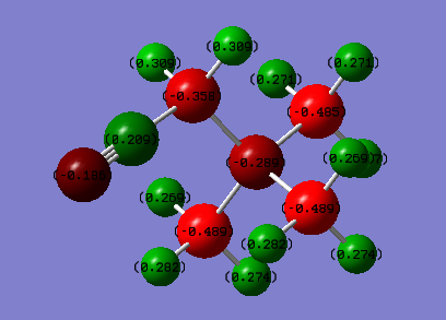 The HOMO for [N(CH3)4]+ is large and encompasses the whole of the molecule. There is a nodal plane down the middle so the shape is symmetrical; this is expected as the molecule itself is very symmetrical. The HOMO for [N(CH3)3(CH2OH)]+ covers less of the molecule and is mostly dominated by the p orbitals on the CH2OH fragment. The HOMO for [N(CH3)3(CH2CN)]+ is similar to that of [N(CH3)3(CH2OH)]+ as it is dominated by the antibonding p orbitals on the CN fragment, but the are far fewer orbitals over the rest of the molecule, only two small p orbitals on two of the carbons.