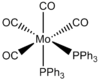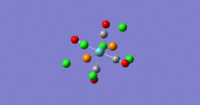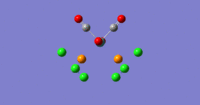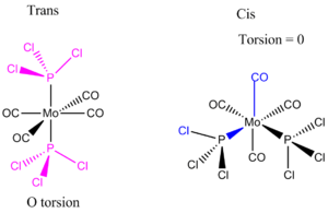 Mo(CO)4(PPh3)2 is too heavy and large so computational demand is huge, instead the Ph groups are replaced by Cl atoms. Chlorine is suitable due to having very similar bonding and occupation of space sterically. Mo(CO)4(PCl3)2 is examined using DFT-B3LYP method and LANL2MB minimal pseudo potential for the core electrons. The limit for convergence is set to loose in order to gain the optimum bond lengths and angles in an approximate geometry structure. This was used to calculate the optimisation for the cis and trans isomer shown below. The Jmol structure is attached.