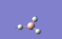 | 3 | Rocking – One hydrogen swings from side to side and the other two hydrogens keep an equal angle between them as they rock. This means that the single hydrogen that moves side to side continuously changes its angle with the other two rocking hydrogens. In total one H-B-H angle expands, one is constant and one is constricted. The conservation of the centre of mass again occurs as the smaller movements of the atoms other than the hydrogen moving to change the two H-B-H angles are able to balance it. | E' | 1203.64 | 12.3173. | 1196.7 | |