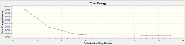 In both geometric isomers the final energy of -617.52au is the same. The main difference is in the dipole moments where the cis isomer has 8.5D whilst the trans has zero. The reason for the zero dipole moment in the trans is that the symmetry is very high. The cis isomer has 13 iterations and the trans has 4 iterations. The trans has a smoother curve. Both reached a stationary point but this was not the most optimised geometry as it was only a local minimum not a global one.