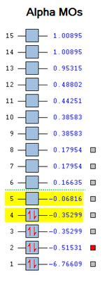 The Molecular Orbitals were calculated using the previous optimised file with key words “pop=full”, a basis set of 3-21G and the DFT-B3LYP method as before asking for full NBO’s. The advantage of computationally analysing the electron density is that the MO’s can be generated and matched to those produced by normal MO diagram analysis. DOI:10042/to-12237