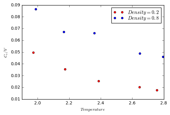 In this section, simulations were ran at 10 points and at two different densities (0.2 and 0.8). For each density, the simulations were run at 5 temperatures (2.0, 2.2, 2.4, 2.6 and 2.8).