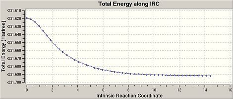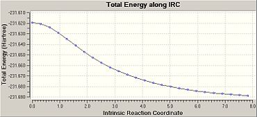 The IRC was restarted as before but this time with 150 steps instead of 50.[17] As can be seen it has an energy of -231.68863 a.u. and a point group of C2, however the IRC plot indicates that it has not achieved a complete minimum and has only achieved a local minimum.