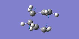 A Opt-Freq calculation was then carried out using the TS(QST2) method with the correct atom numbering[11]. This however failed and looks more like a chair structure, this is because the calculation translates the top fragment and does not rotate around the central bond. The product and reactant structures therefore must be changed for QST2 to give a reasonable transition state. The central C-C-C-C dihedral angle was changed to 0o and the inside C-C-C bond was changed to 100o, this leads to the structures below.